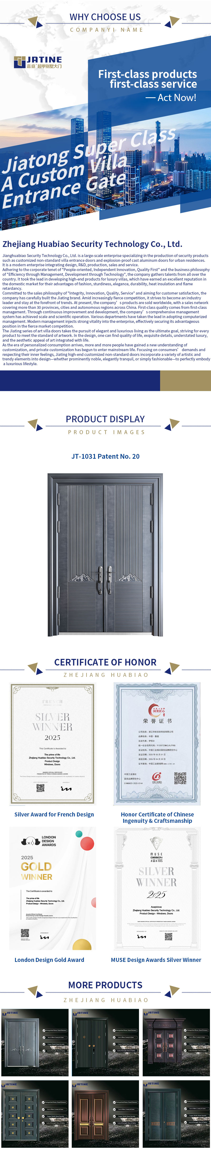 Каждый продукт изготовлен из высокопрочных материалов, обеспечивающих длительный срок службы, стабильность и устойчивость к ежедневному износу и погодным условиям. Наши проекты нестандартных размеров позволяют гибко сочетать их с различными конструкциями вилл, создавая скоординированный и высококлассный эффект входа. Серия из взрывозащищенного литого алюминия отличается прочной конструкцией, отличными характеристиками защиты от взлома и повышенными характеристиками безопасности, что делает ее идеальным выбором для семей, придерживающихся более высоких стандартов безопасности.