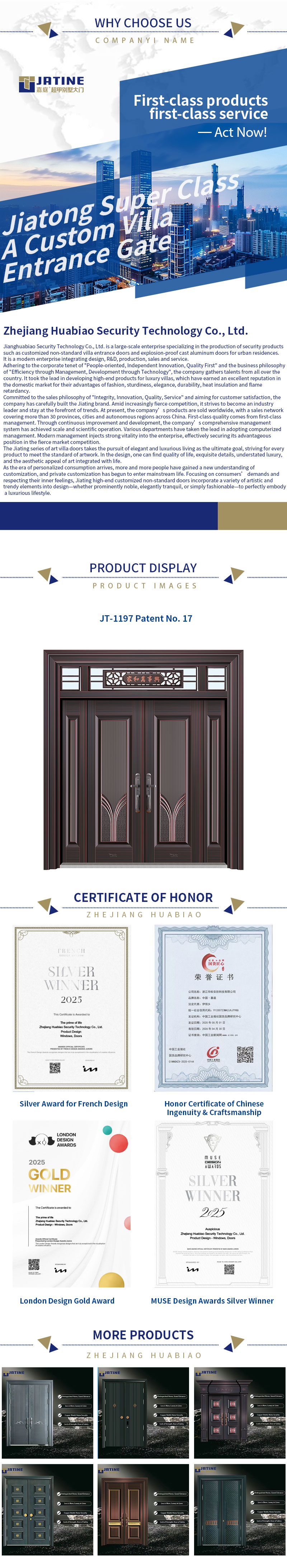 Каждый продукт изготовлен из высокопрочных материалов, обеспечивающих длительный срок службы, стабильность и устойчивость к ежедневному износу и погодным условиям. Наши проекты нестандартных размеров позволяют гибко сочетать их с различными конструкциями вилл, создавая скоординированный и высококлассный эффект входа. Серия из взрывозащищенного литого алюминия отличается прочной конструкцией, отличными характеристиками защиты от взлома и повышенными характеристиками безопасности, что делает ее идеальным выбором для семей, придерживающихся более высоких стандартов безопасности.